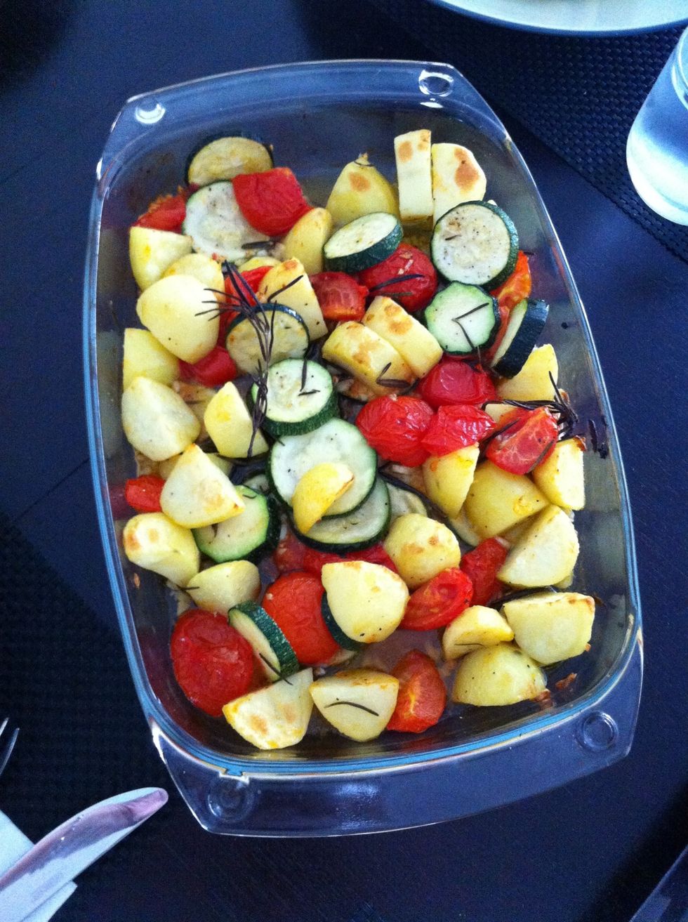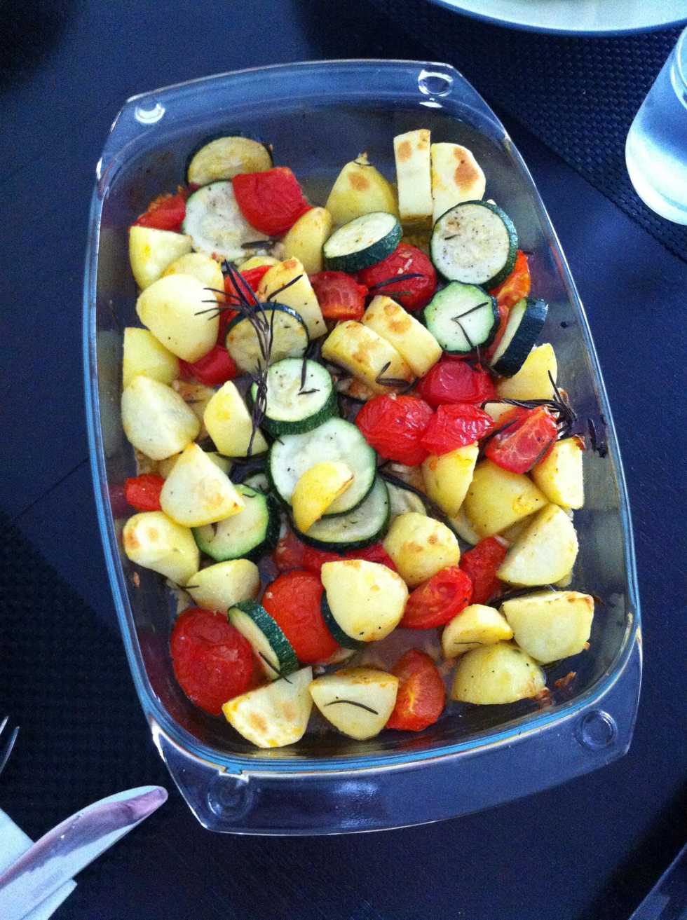 Add rosemary, garlic, pepper, salt and lots of olive oil to the veggies...
