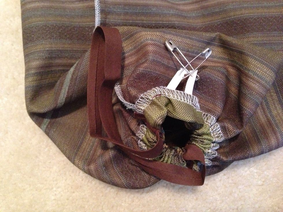 Notice bias tape has 2 stitch lines. Leave 1/2" gap NOT sewn for elastic entry. Guide elastic through loop with safety pin.