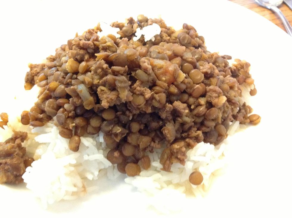 Add meat mixture to lentils. Add one bay leaf and salt and pepper to taste. Simmer five to ten minutes.