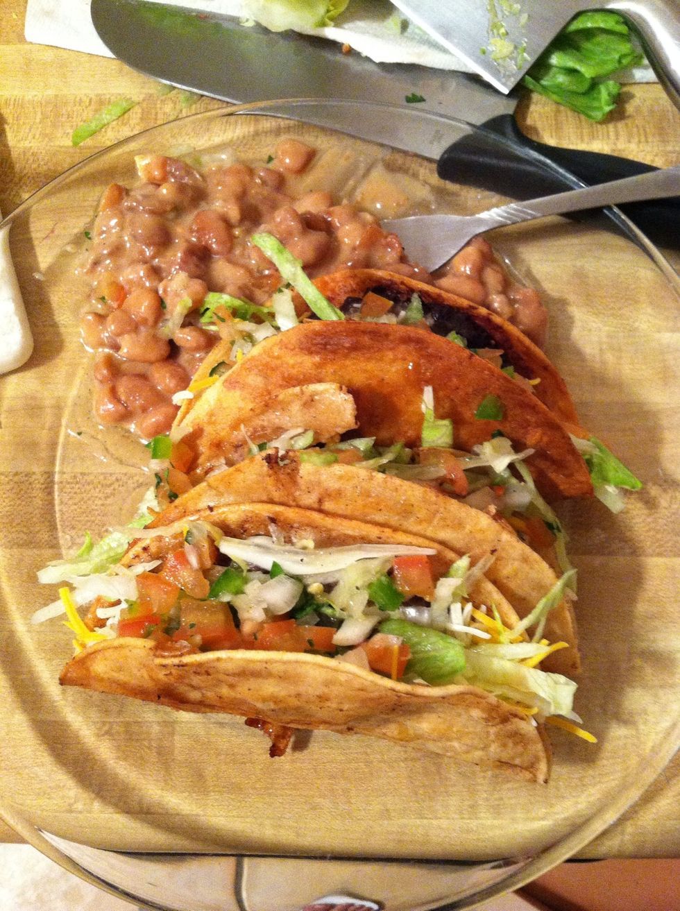 Enjoy with shredded cheese, lettuce, diced tomatoes, and hot sauce. Yum!!