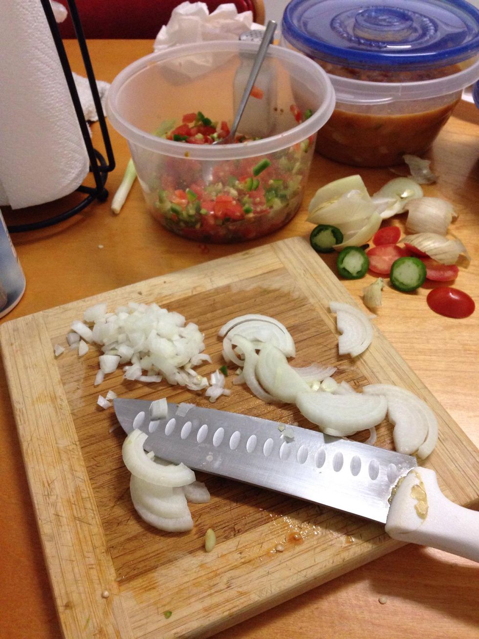 Dice all ingredients and smash avocados. Mix together and enjoy.