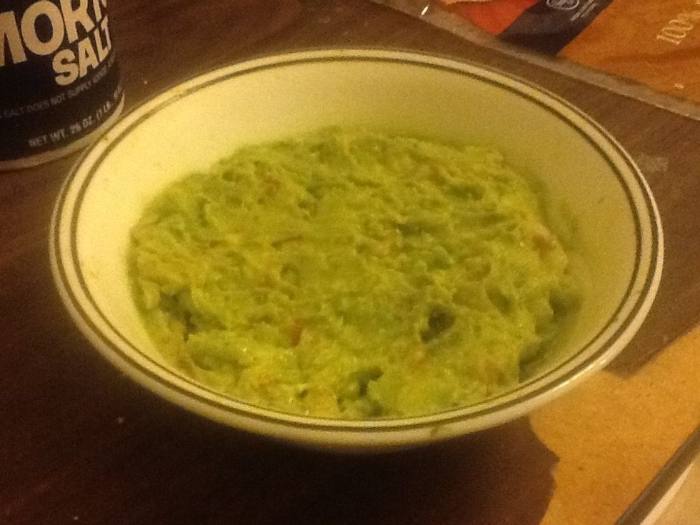 Ingredients: avacado, half tomato, half onion, one teaspoon sour cream, salt, pepper, lemon/lime, cilantro