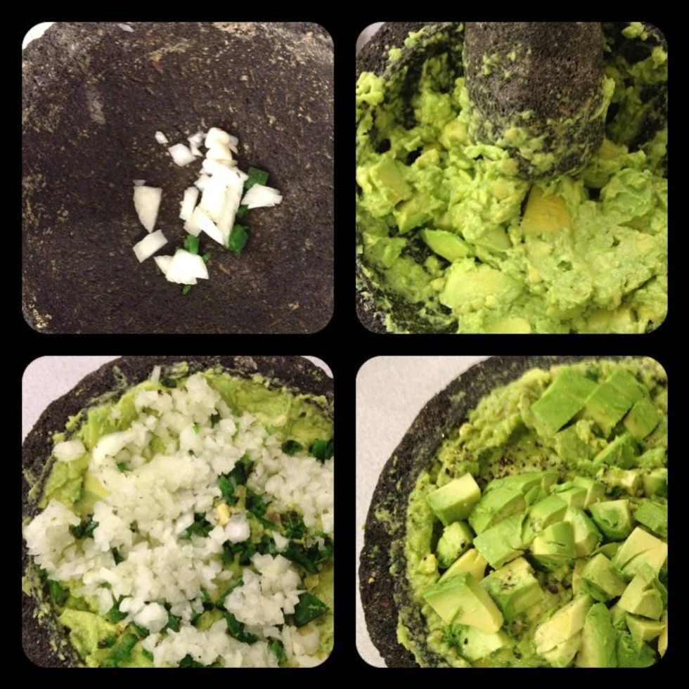 Add 2 remaining chopped avocados to the mixture. Squeeze 1/2 lime on top of avocado mixture. Gently mash with molcajete stone or a fork, leaving chunks of avocado.