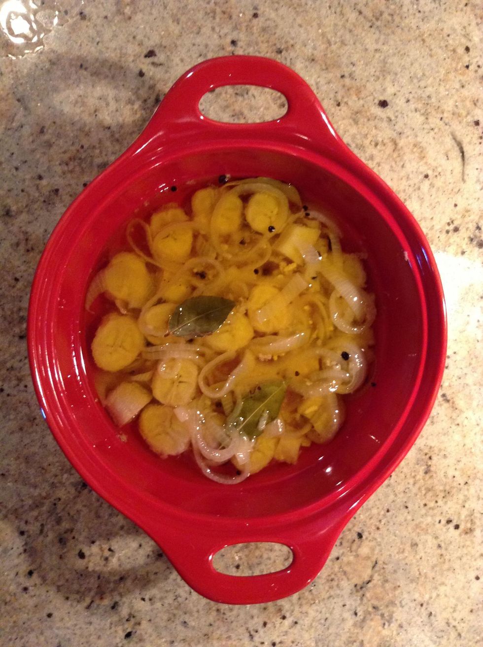 Boil water. When water is boiling add the green bananas for 15 minutes.