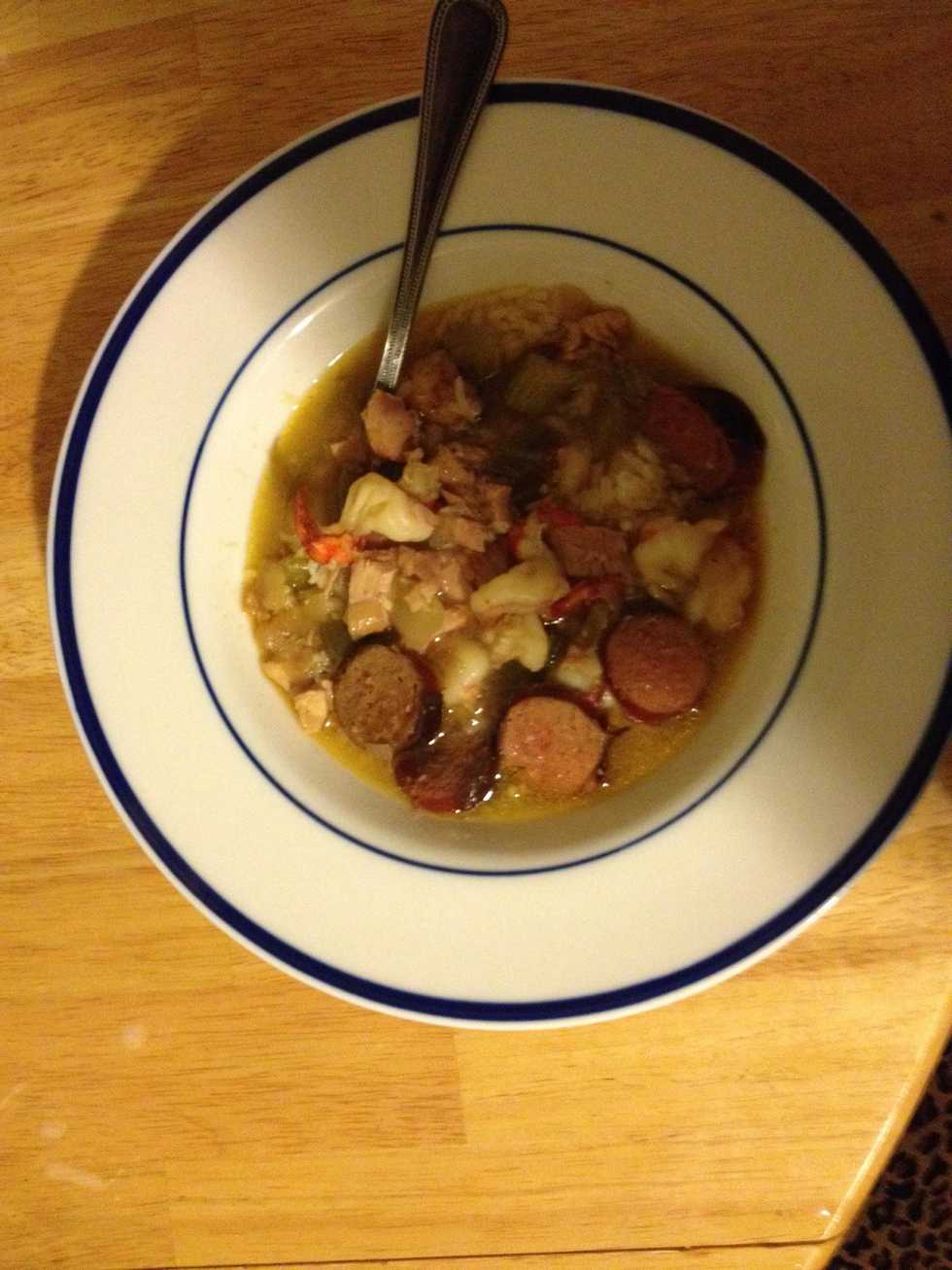 Finished gumbo clear broth with shrimp, chicken and sausage