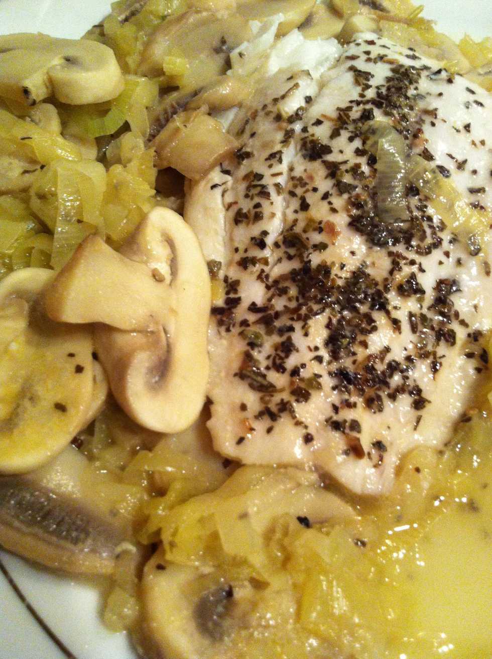 It's haddock fillets and white wine with button mushrooms. Very simple and delicious recipe.