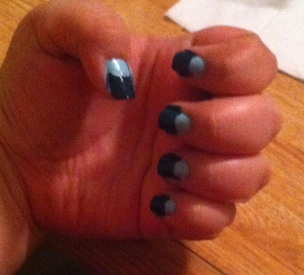 Finish result.The nail polish im usingThe dark color im usingAfter 2 coats put a paper reinforcer on the nail.Like this.Then just paint the darker color on top. While its still wet, remove the paper reinforcments.