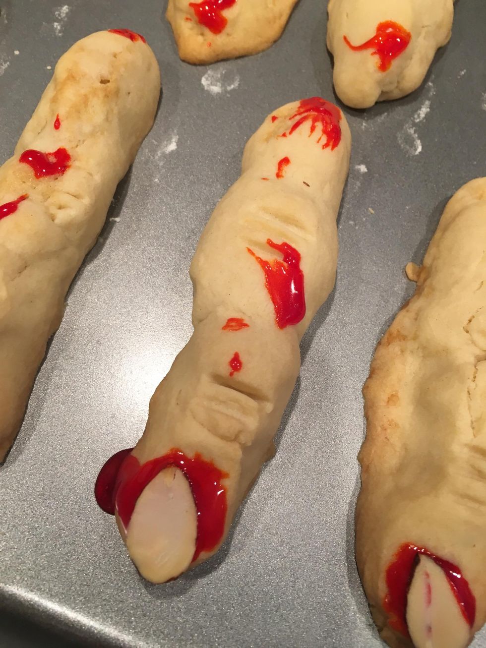 Roll out dough in skinny logs (about 1 1/2 teaspoons). Press top for nail bed and place almonds. Cut the dough where knuckles should be