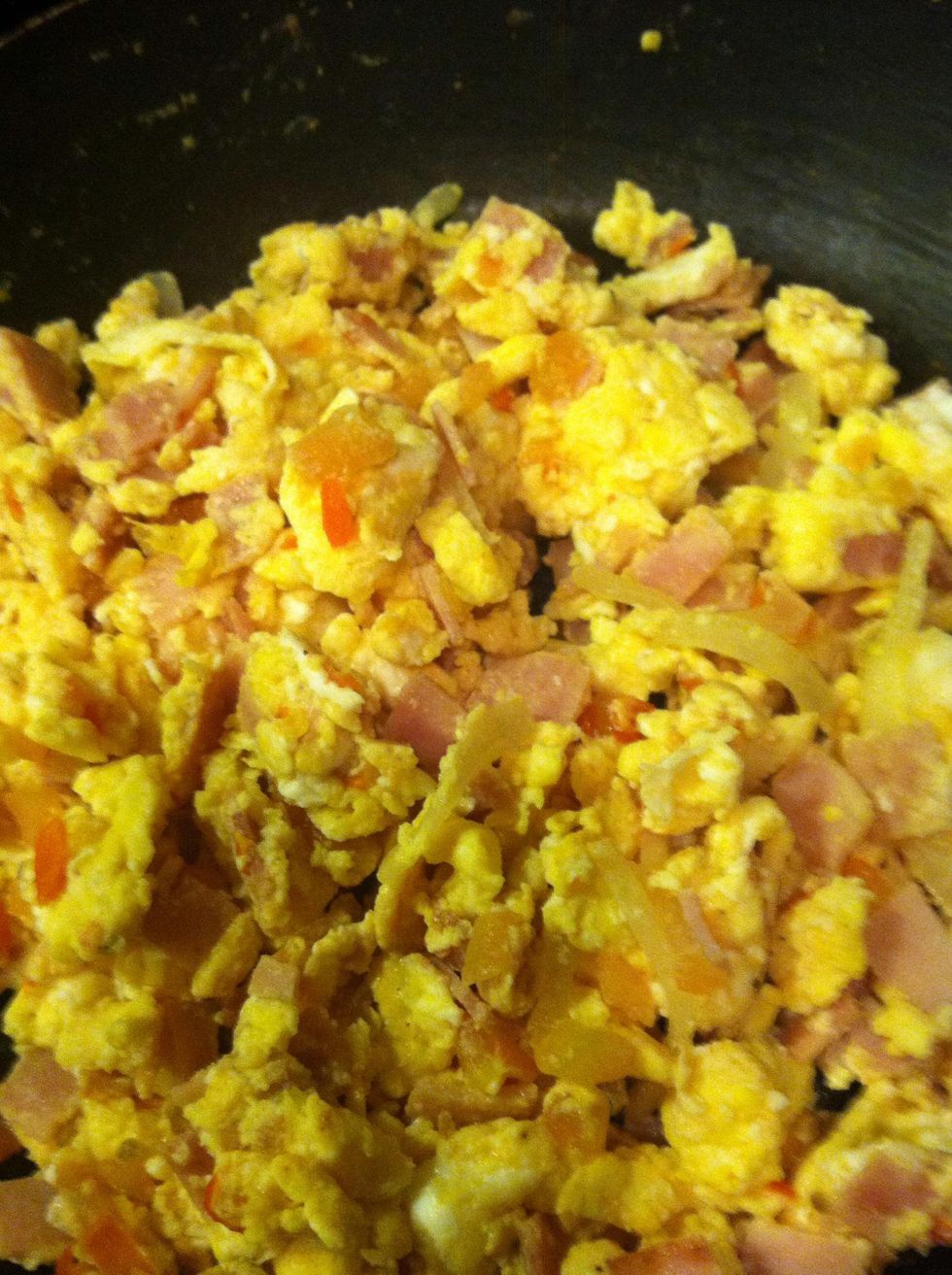 Add your eggs, salt and pepper and scramble in pan. Or u can scramble them in different dish and pour them in pan