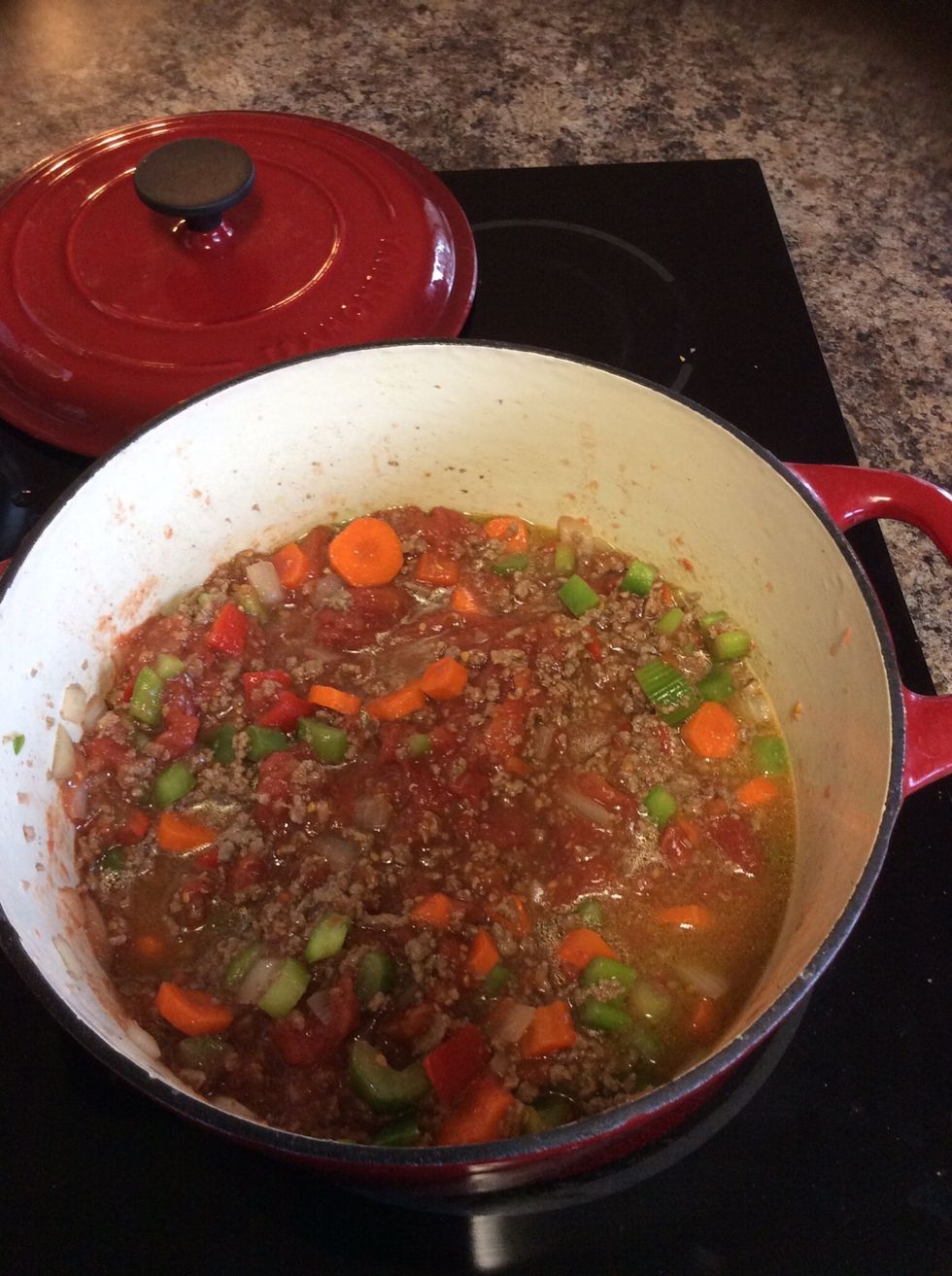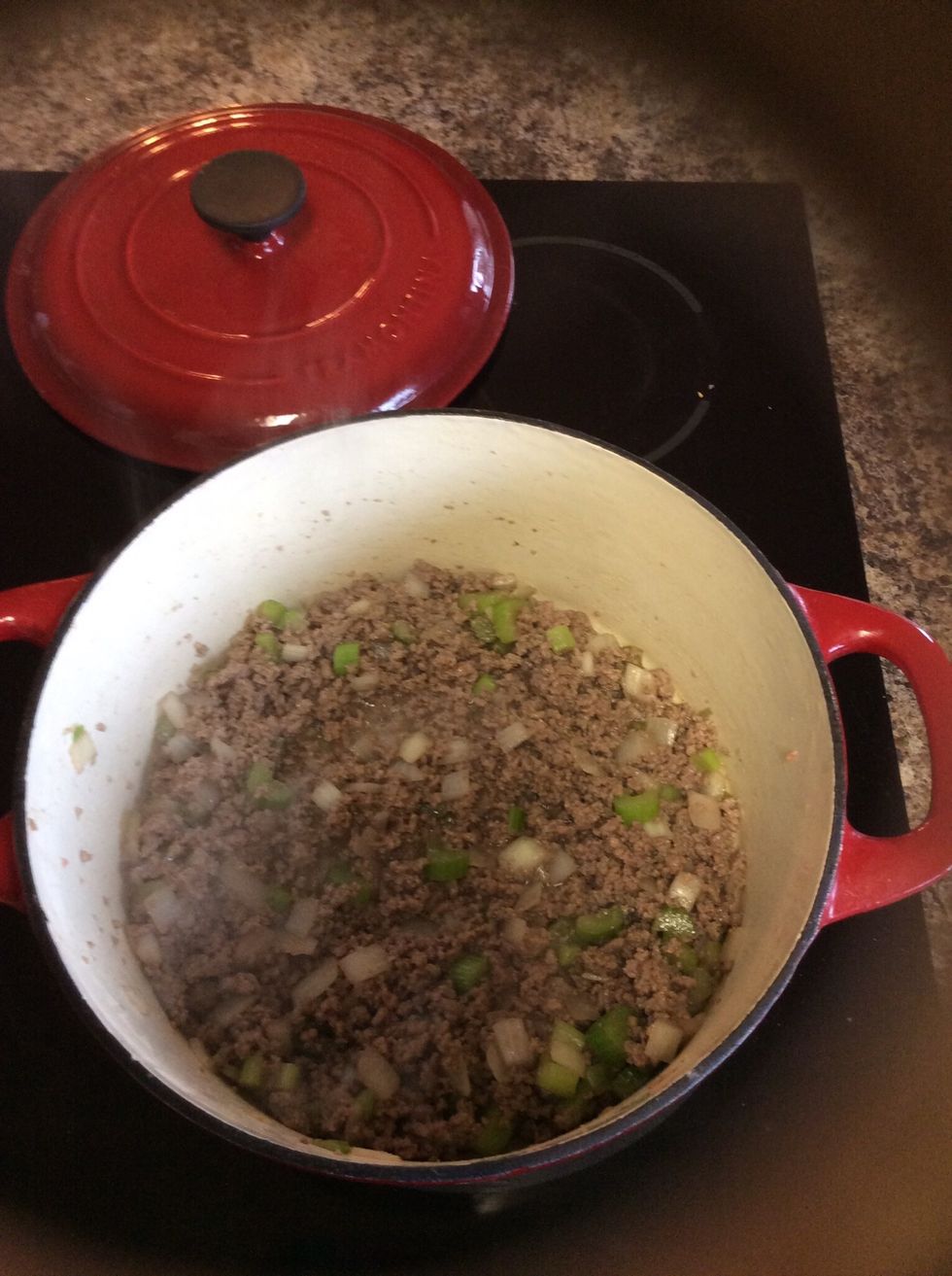 Brown beef, celery, onions, and garlic (preferably) in a Dutch oven on medium-high heat.