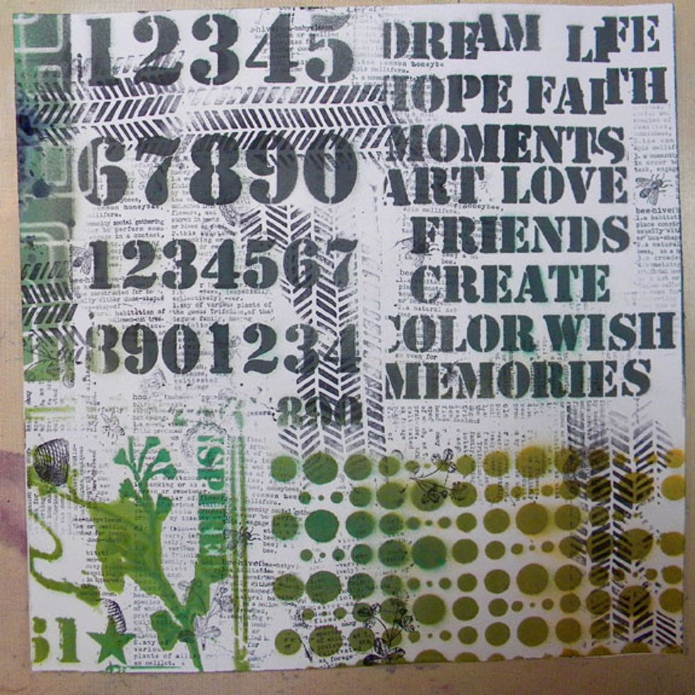 Here is the other piece of cardstock I placed on top of the stencils. I really don't care about the words and numbers being backwards. I love the cool negative pattern the technique created.