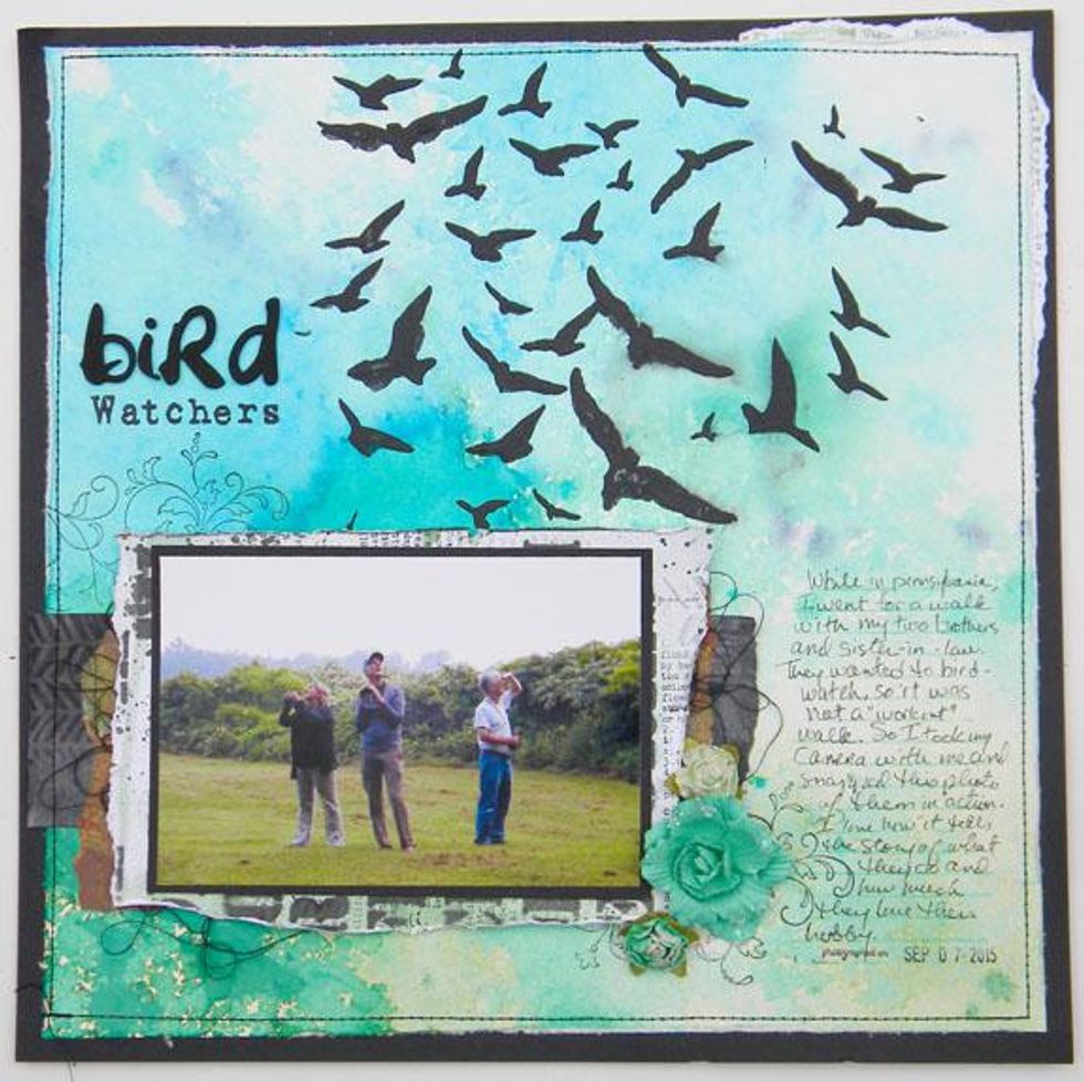 I chose one of the blue and green backgrounds to make a scrapbook layout using a photo of my brothers. I wanted to add birds to the "sky" using Tuxedo Velvet and the Take Flight stencil.