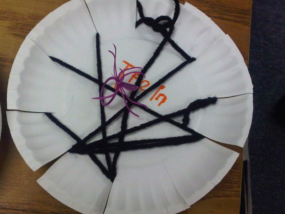 Using yarn, the child wraps it around randomly from spot to spot front to back filling in all the spaces to create what looks like a spider web. Add a plastic spider to the yarn in the process.