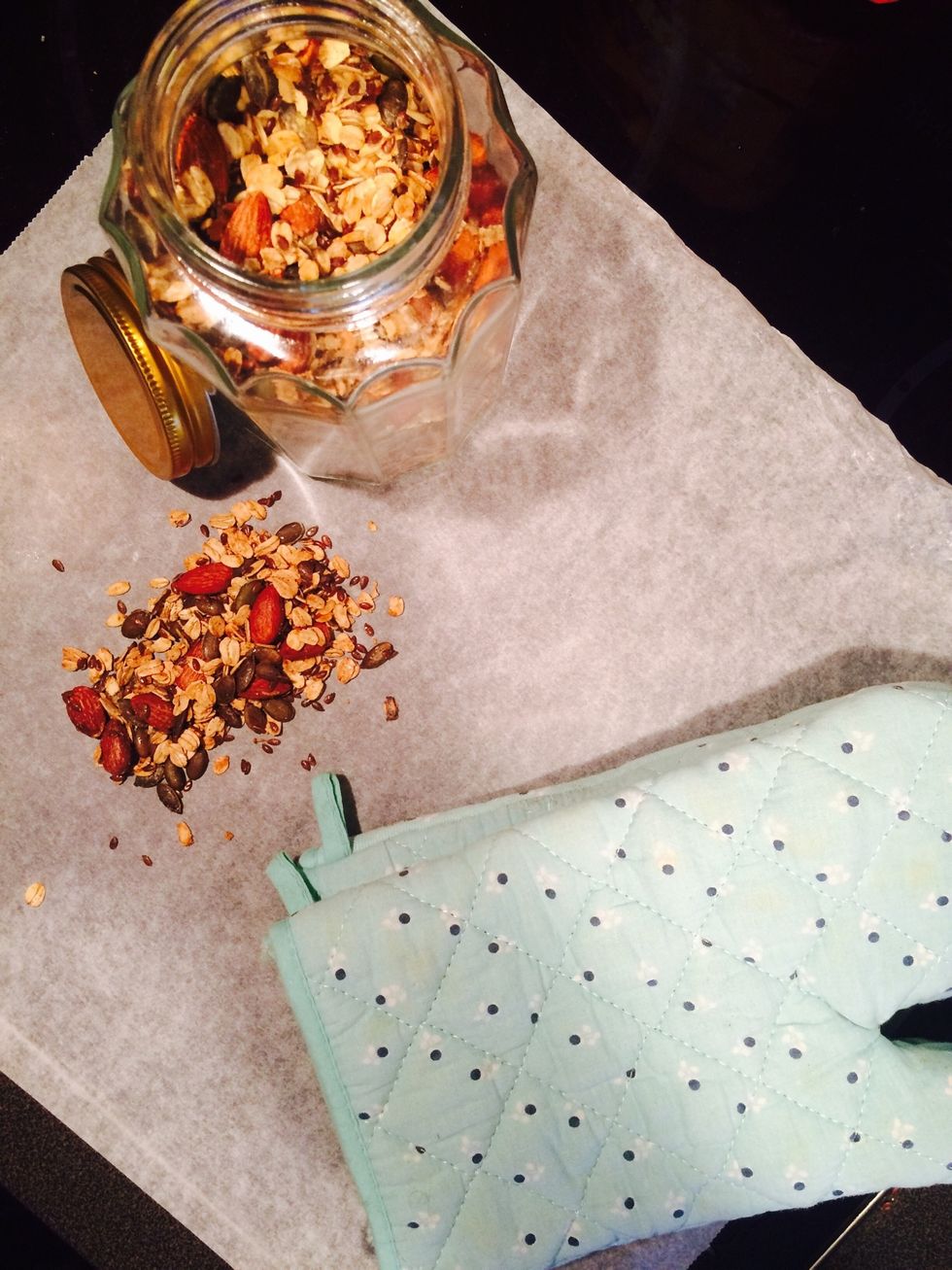 Heat oven to 175 degrees celcius. Heat for 5-10 mins, take out and toss the granola around. Heat for another 5-10 mins.
