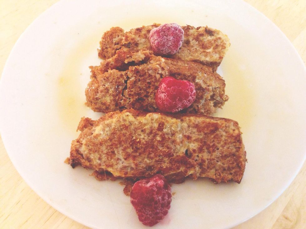 Ingredients for the toast: 3 slices banana bread, maple sirup, almond milk, egg, vanilla extract, fry light