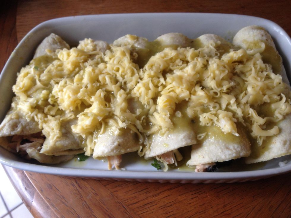 Top finished enchiladas with extra sauce and 1 blue container cheese for ever 3 enchiladas