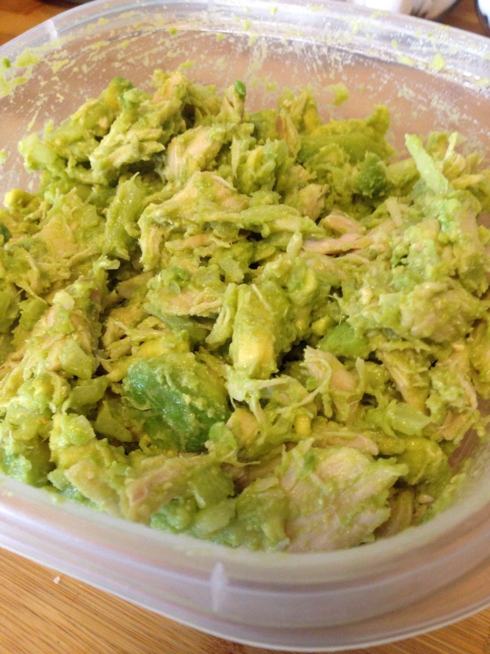 Combine the avocado/onion/lime mixture with the shredded chicken and stir very well. Add salt to taste and optional cilantro and store in fridge until ready to eat!