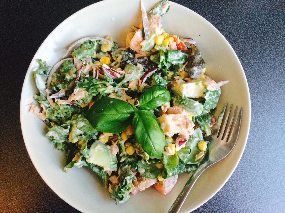 Ingredients: Salad, canned tuna, light sour cream, tomato, avocado, canned corn, red onion, basil and a choice of spice(s) (I used one with pepper and garlic).