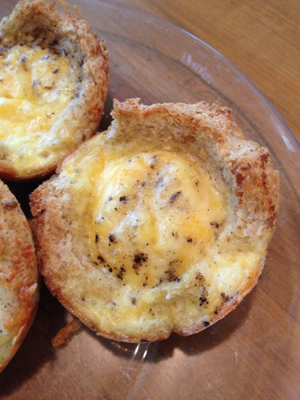 Now just spoon the egg mixture into the little bread cups- I used about 2 spoonfuls each