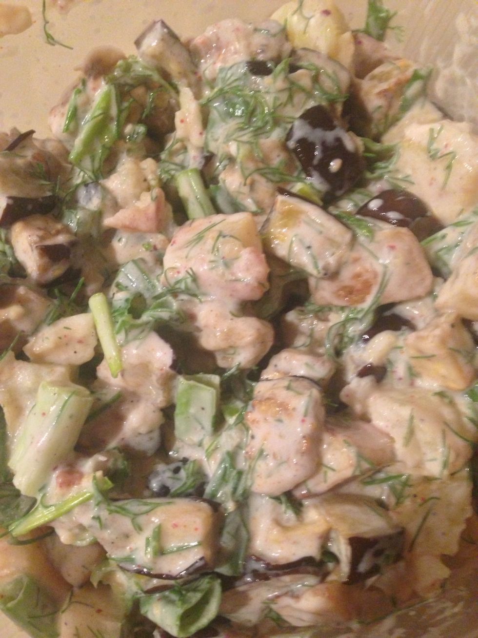 Mix all together and voila. You have yummy potato and eggplant salad , you can serve it as aside dish with any main dish . BON APPETITE.