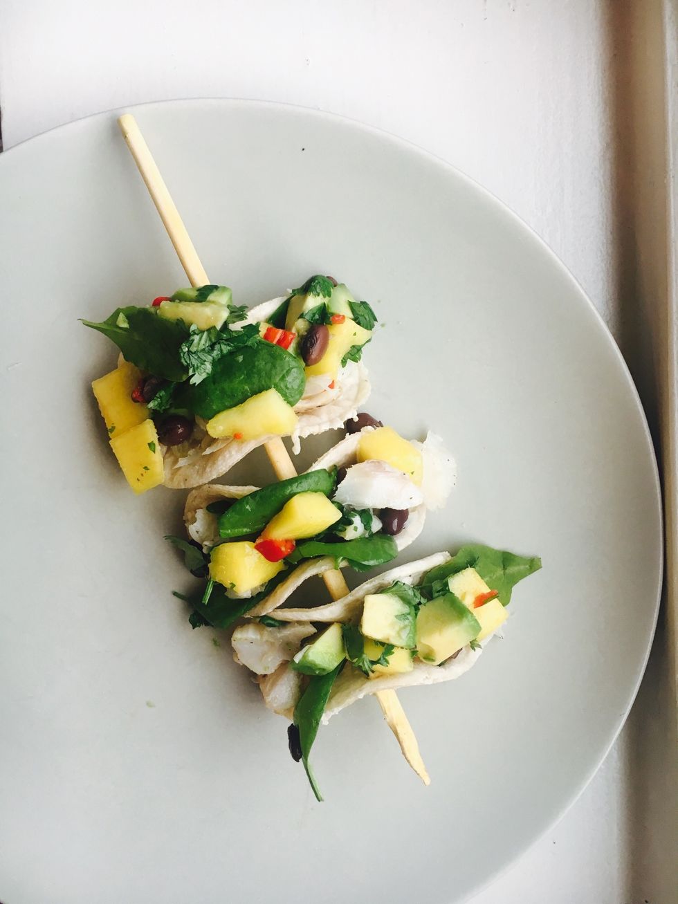 Ingredients: whole wheat & gf tortilla wraps, mango, red chili, lime, coriander,white fish filet, black beans, vegan butter for frying, babyleaf salad mix