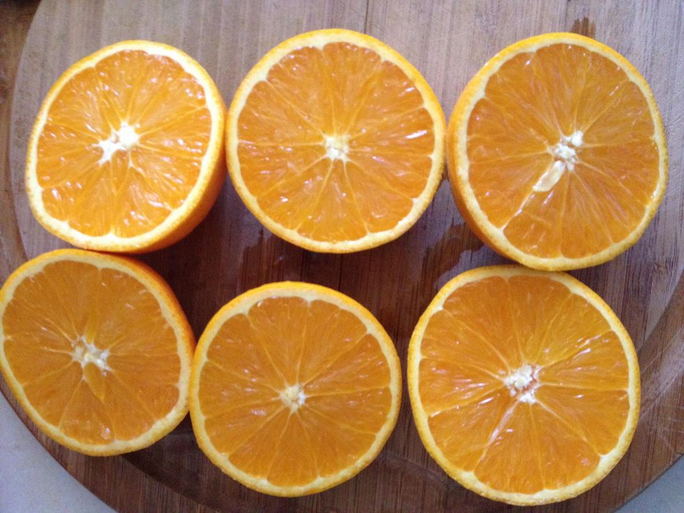 Cut the oranges in half sideways. So the top and bottom of the orange end up on opposite ends, it makes it easier to juice.