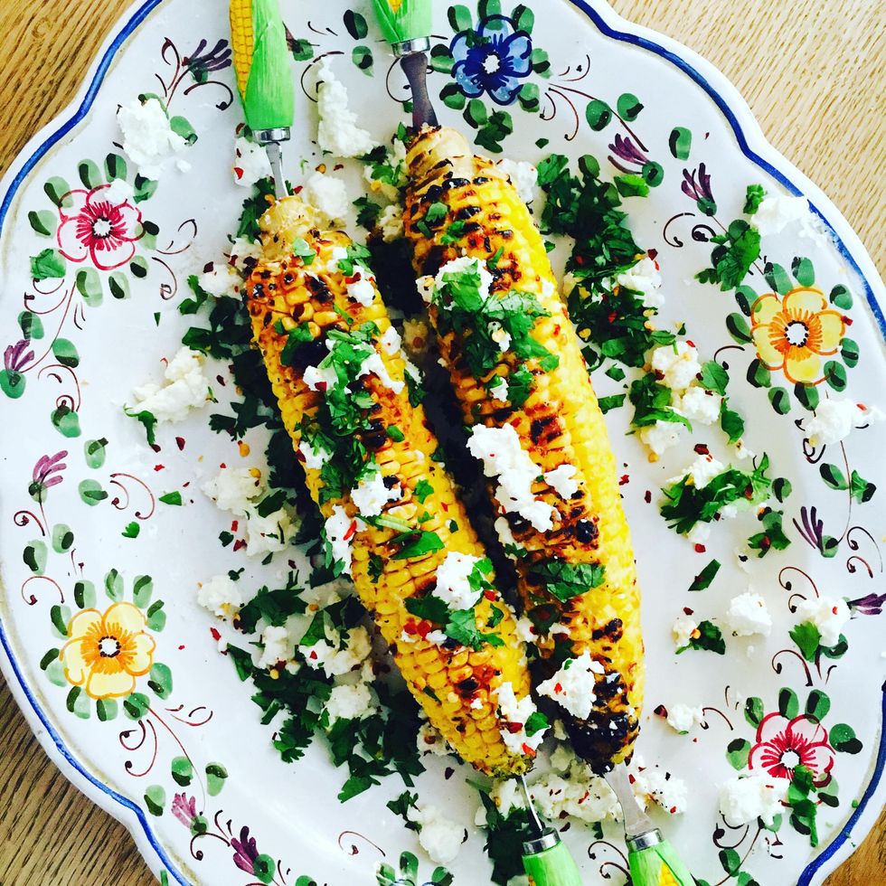 Ingredients: corn cobs, fresh coriander, lime, feta cheese, chili flakes, light mayo