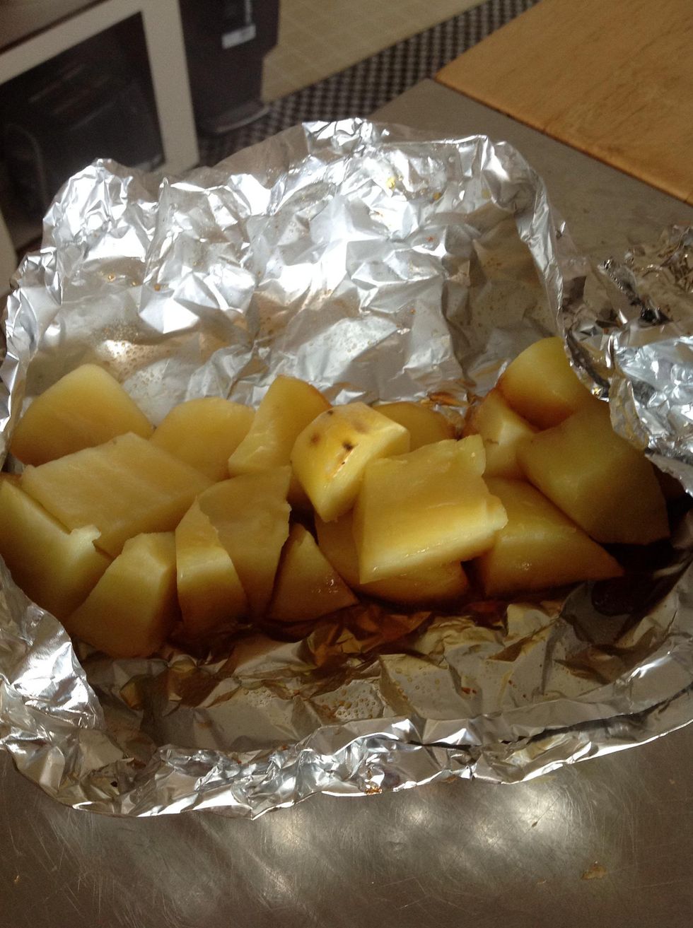 Peel potato and cut into medium chunks. Place on non-stick foil sheet Mix in olive oil well. Drizzle with Agave sweetener. Close packet and roast on hot grill for 15 minutes.