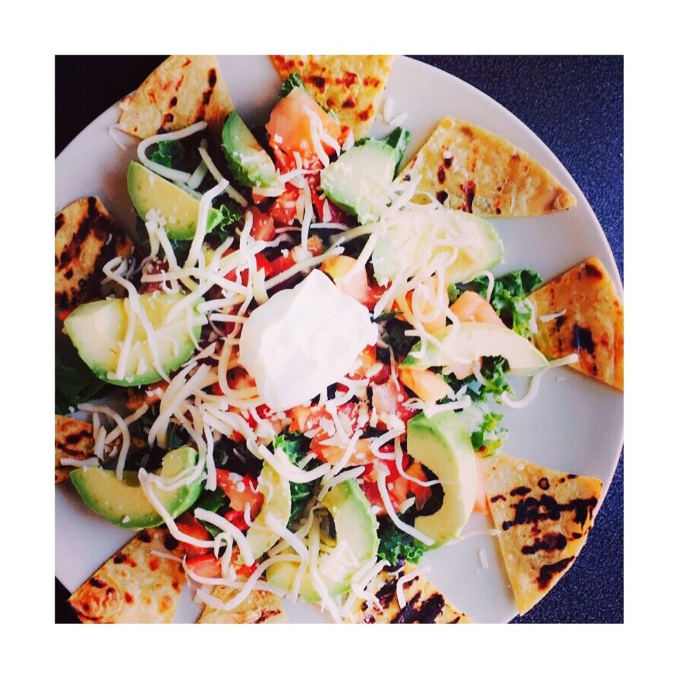 Ingredients: tomato, red chilli, garlic, kale, corn tortilla, quark, light shredded cheese, black beans