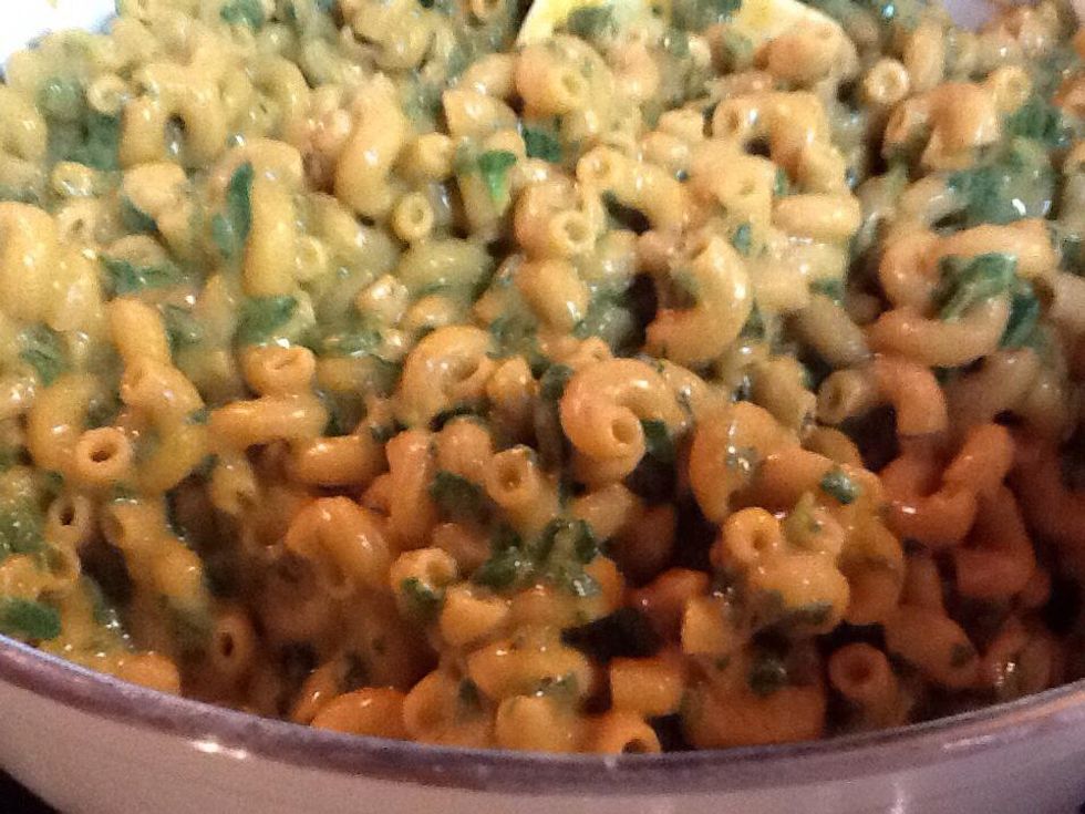 Pour in hot, thickened "cheese" sauce, and stir to combine thoroughly with the pasta & greens.