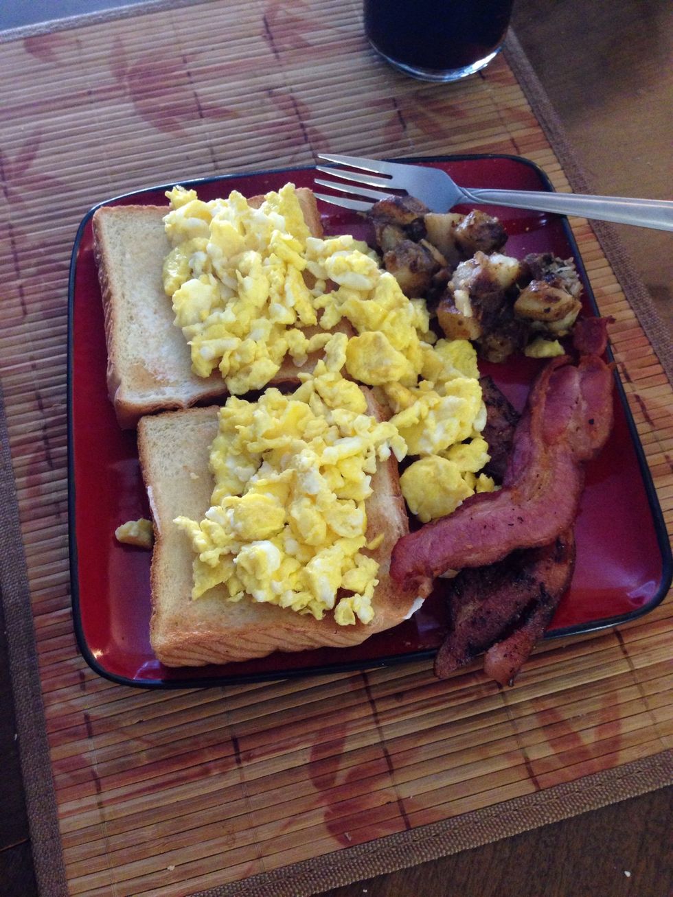 Once the potatoes are finished cooking, year up the bacon and add to the mixture.