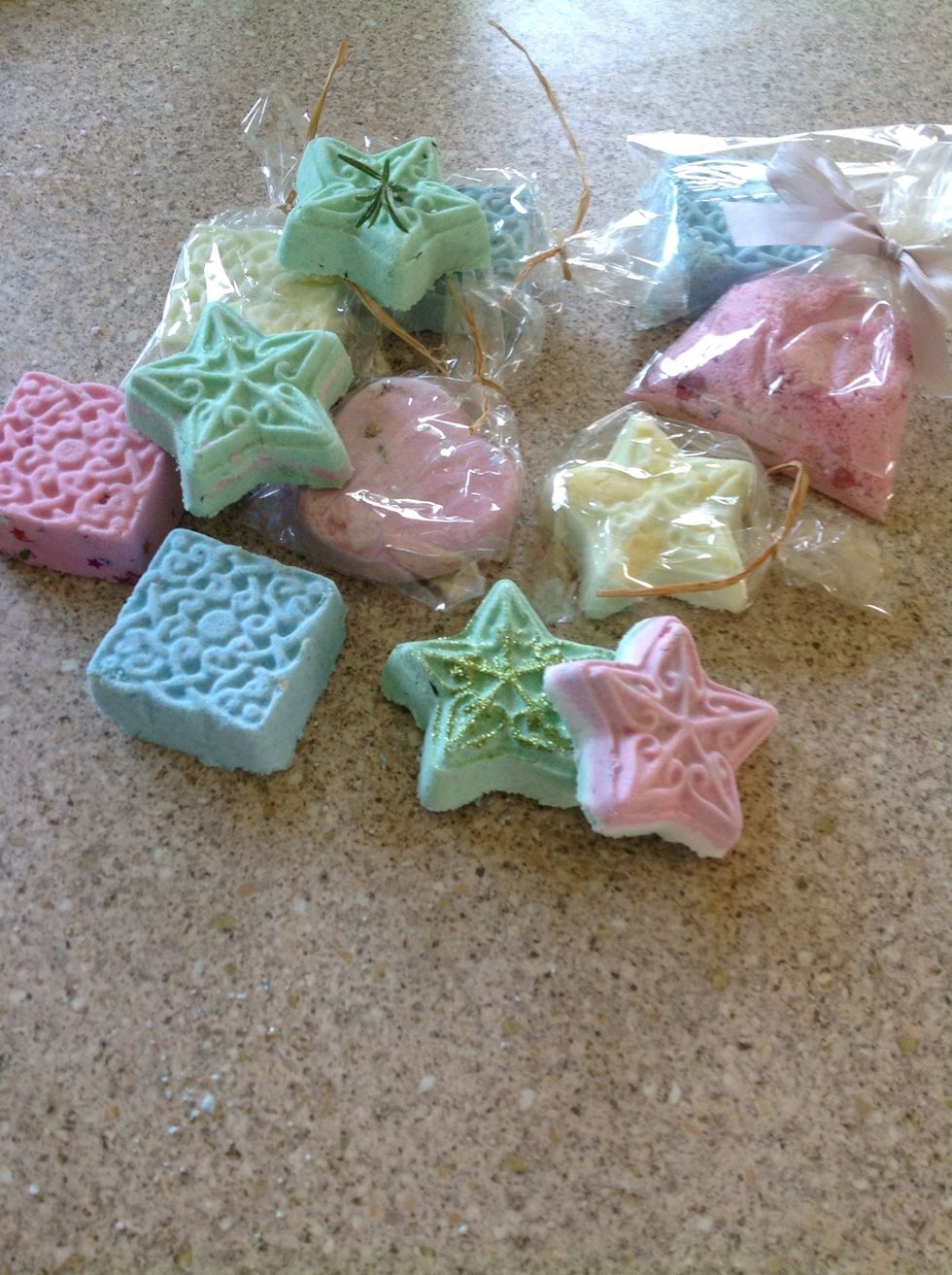 Tools: measuring spoons, one large bowl and a smaller one for each colour/fragrance you are going to make. A knife is useful, and if I am giving the bombs as presents I wrap them in individual bags.