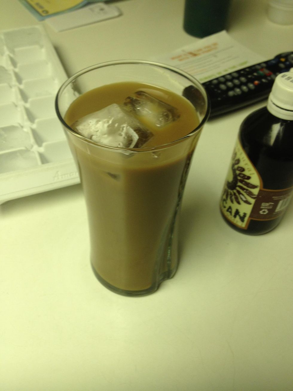 Pour the cold coffee in. I used an old Tim hortons coffee, but coffee pot coffee works great as well, just add milk as well.
