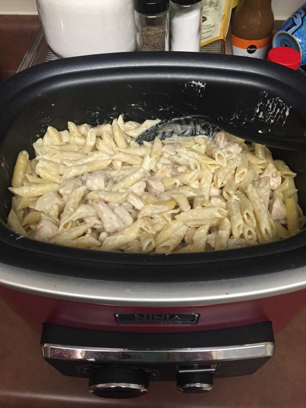 When the sauce is done, combine the chicken, pasta, and alfredo sauce together.