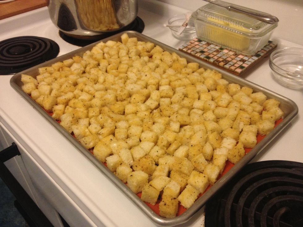 Stir, pour, toss, stir, pour, toss, continue until the croutons are coated.