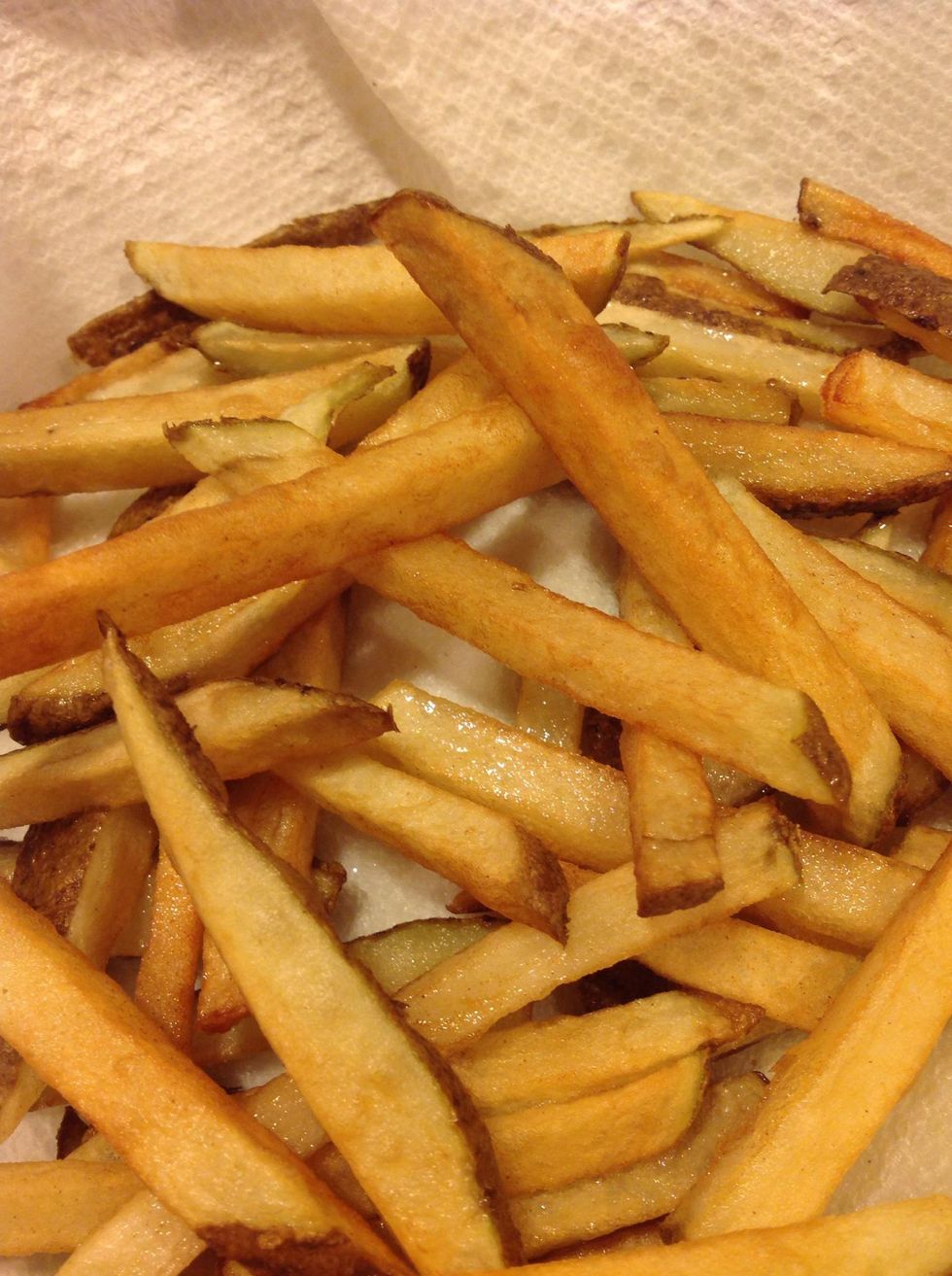 Take them out when golden brown and enjoy! *for extra crispy fries you can boil them in oil twice, once until just barely yellow and wait for them to dry then again until golden brown.