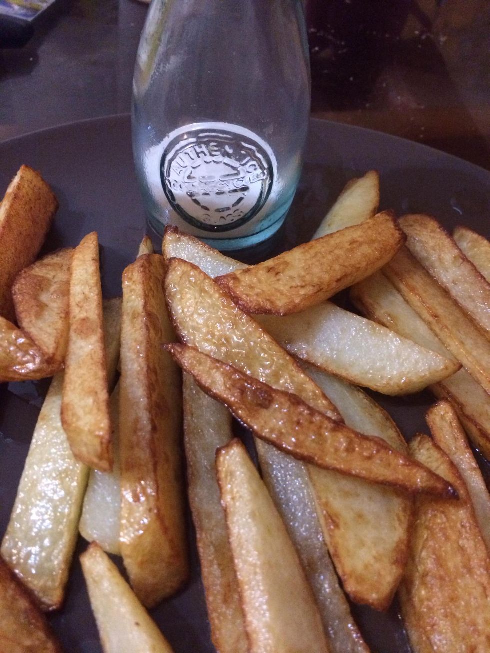 Cut your potatoes into strips Slide them into a pot with a generous amount of oilKeep turning them around until they're light to medium brownThis is how they should lookAdd salt, and you're done!