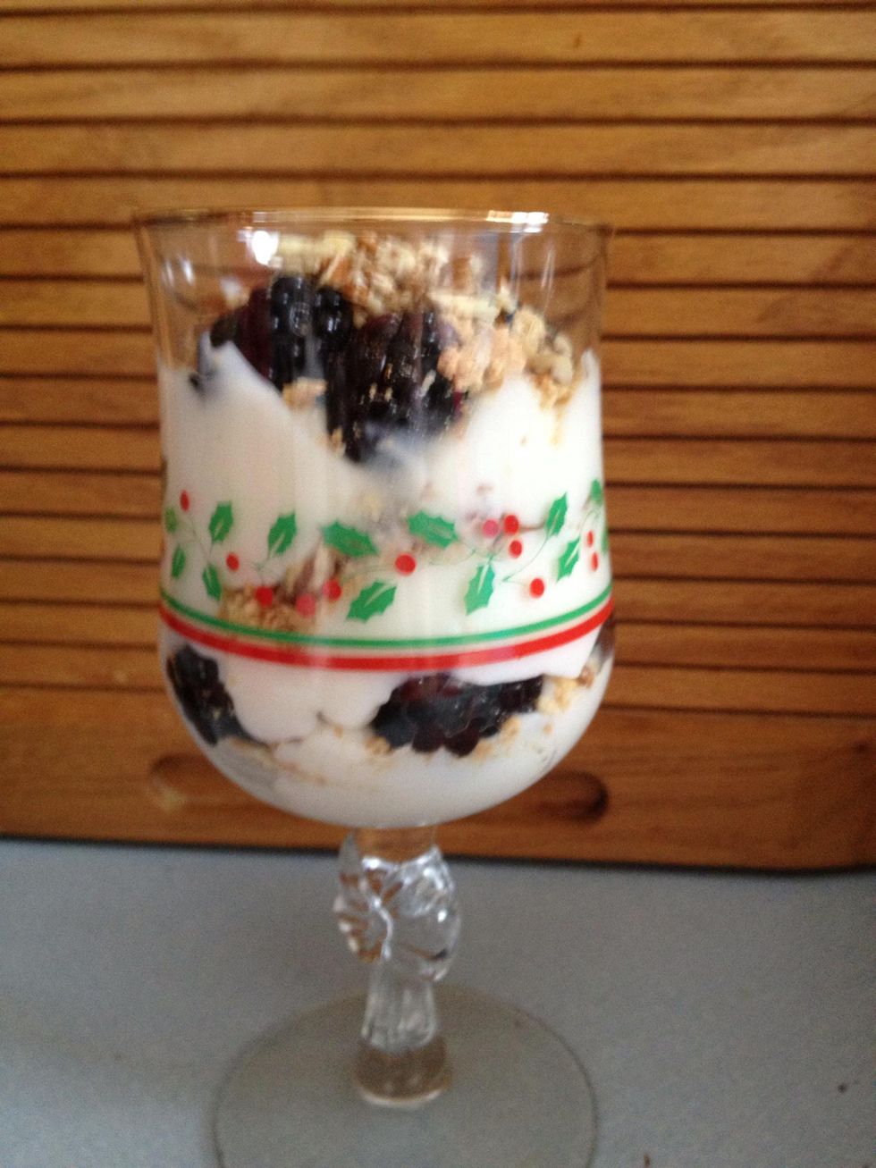 Homemade fruit and yogurt parfait. Substituting graham cracker and nuts for granola cuts calories and sugar. Enjoy!!!