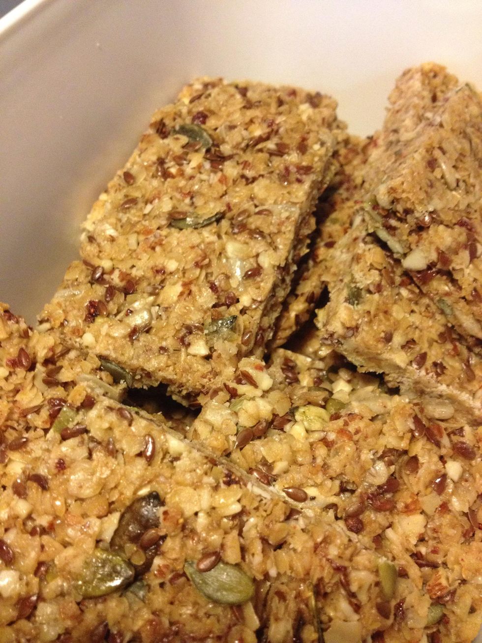 When baked, it should look something like this. It is very important that you let it cool completely before cutting it into bars; if not the bars will break and become muesli instead!
