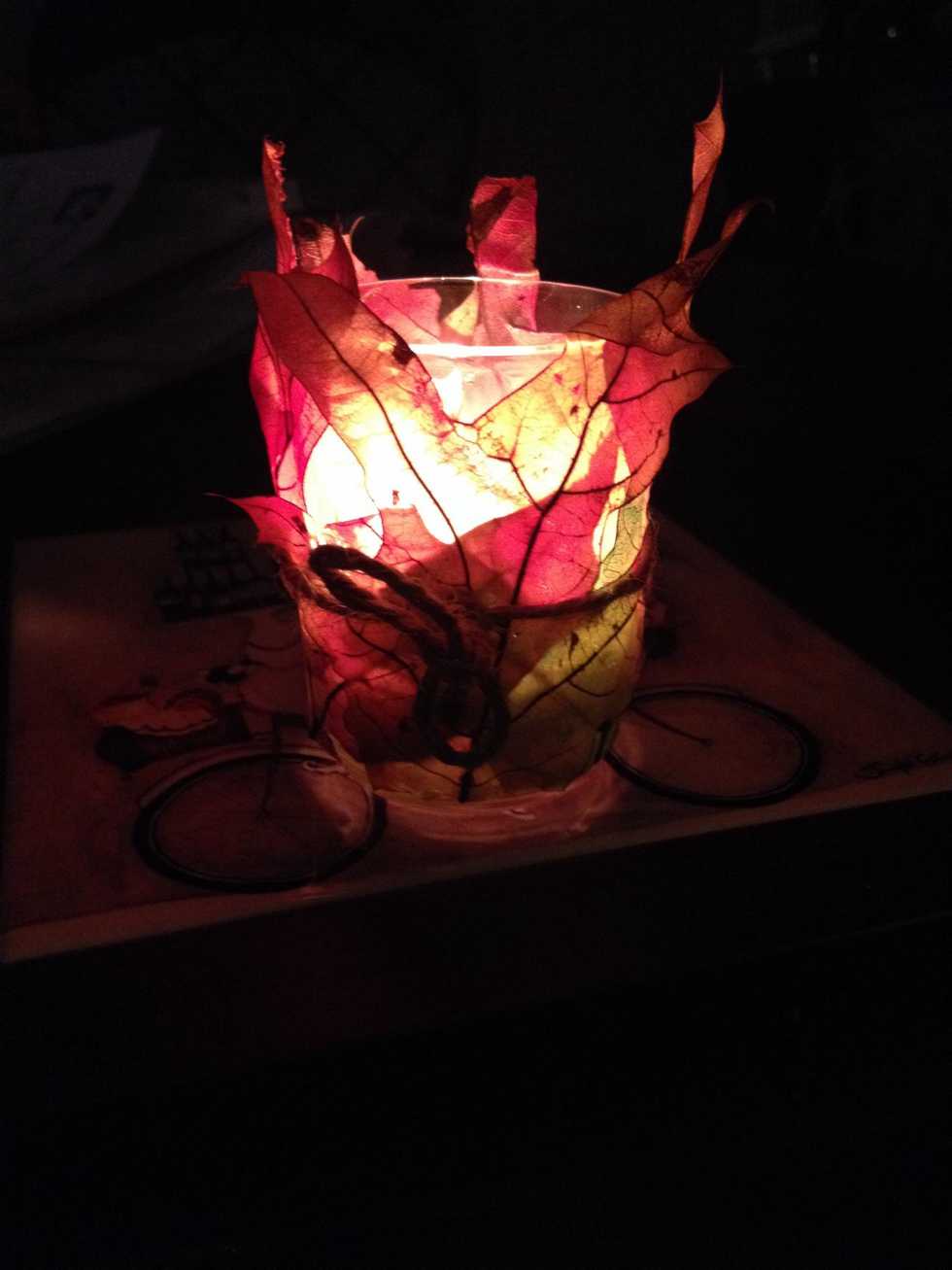 Supply: glue gun, glass candle holder, candles, fake autumn leafs, and twineLike this...Measure a piece of twine to fit your candle holderLike this....This is your finished product! Good luck and have fun!