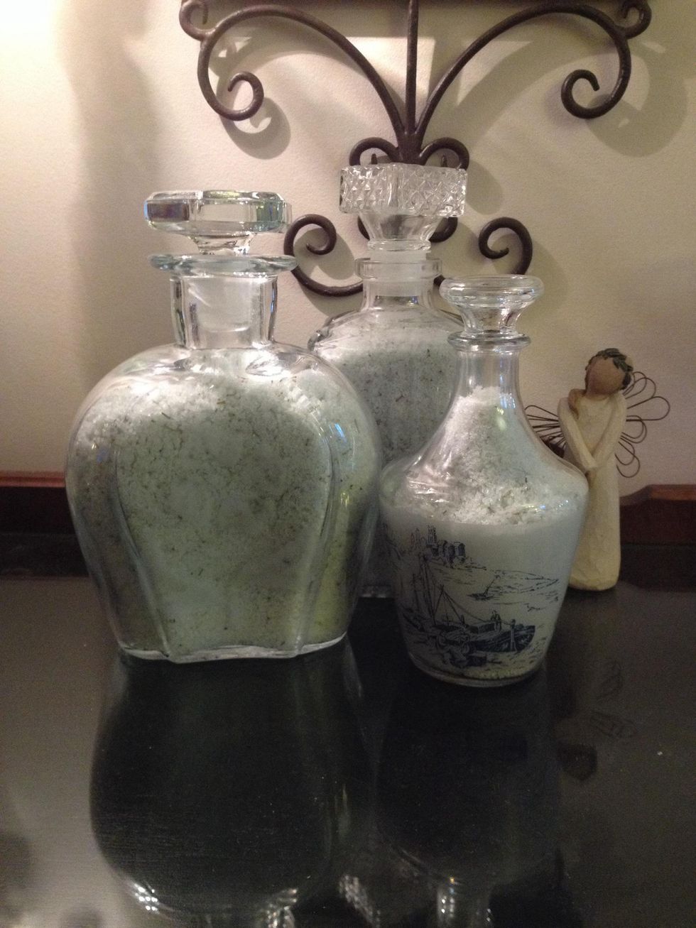 Lavender rosemary bath salts also makes a great gift. I like shopping for old decanters, clean them up with pure Alcohol to remove any stains or white residue on the glass, and fill with salts.