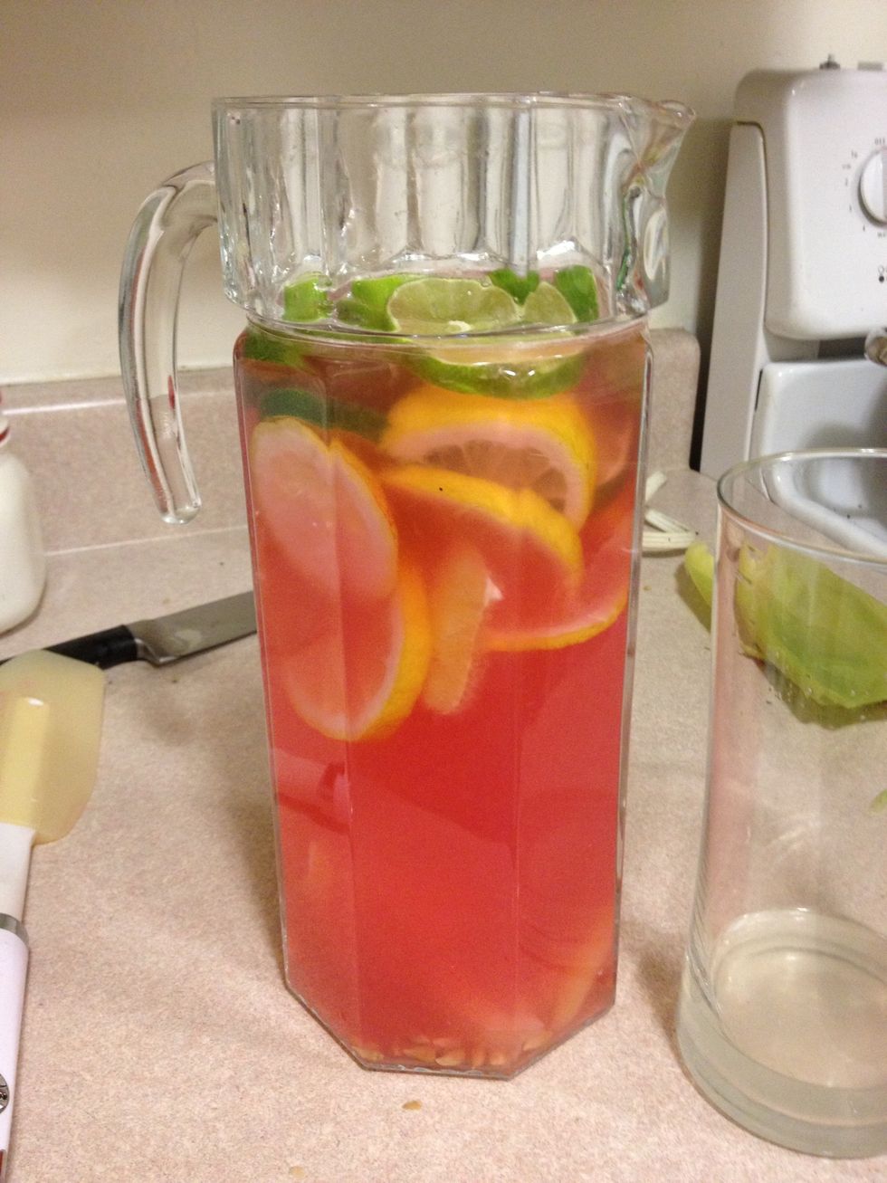 Cut one lemon into slices and put in in pitcher try to pick out the seeds Cut up the limes as well