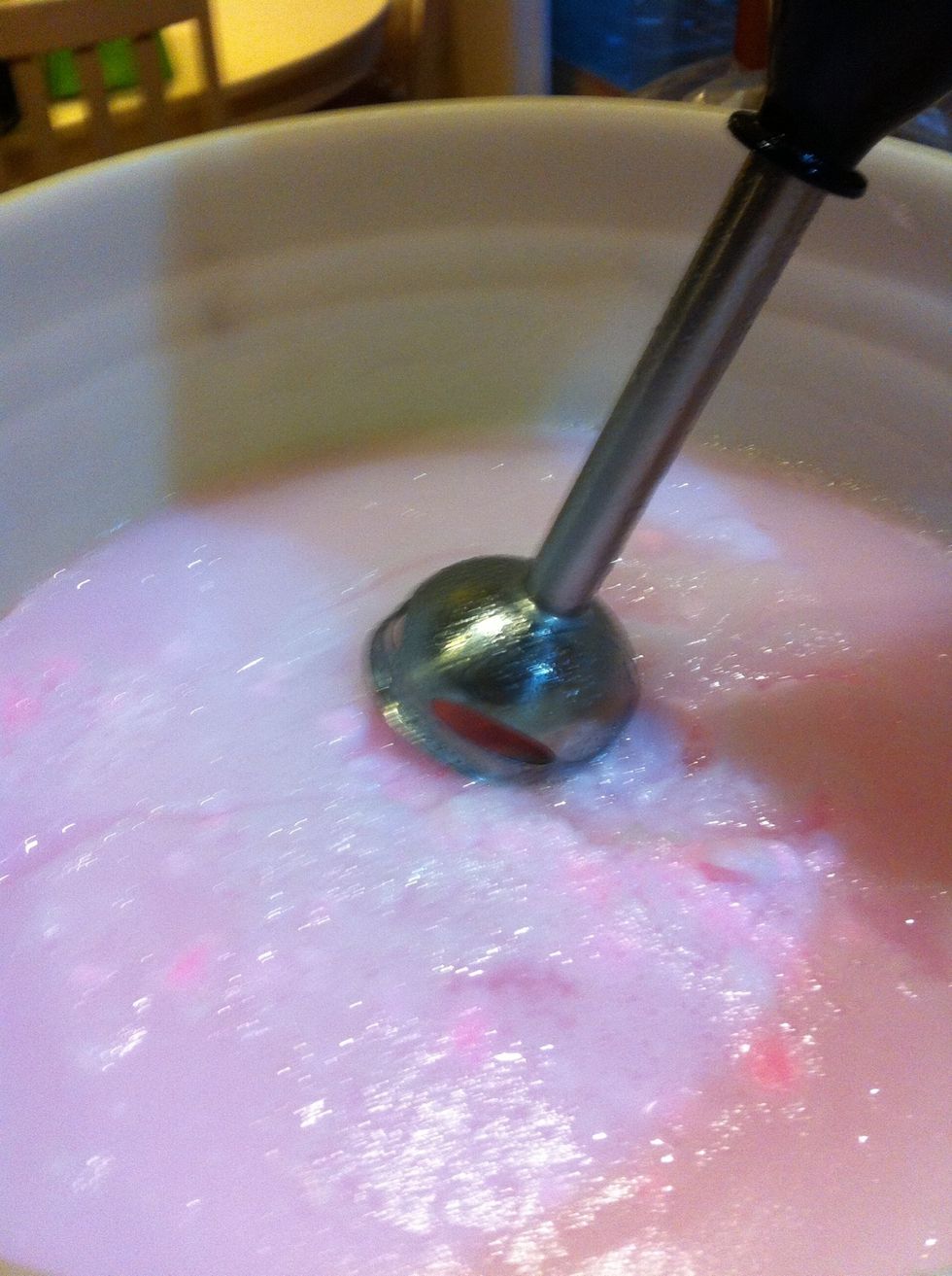 I use an immersion blender to break up all the chunks and create a smooth liquid.