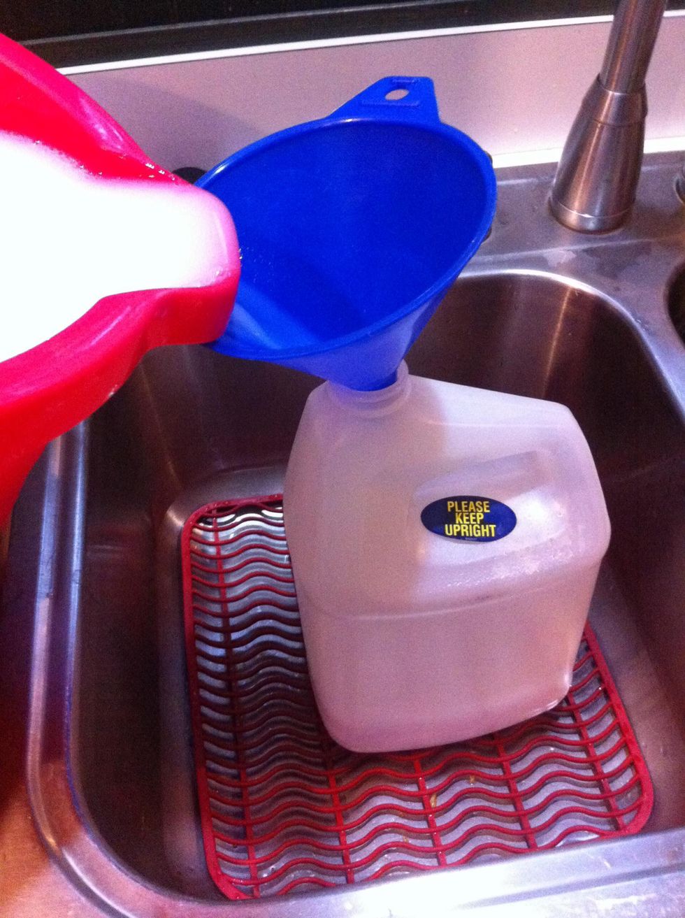 Use a funnel and a bucket with a pouring lid to portion it into containers you can use on a daily basis.