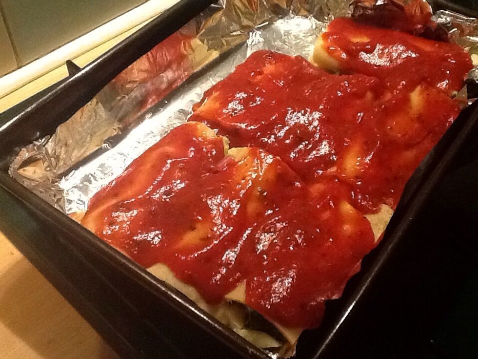 Spoon tomato sauce on top. Used a bottle of Ragu, but I normally make sauce from scratch.