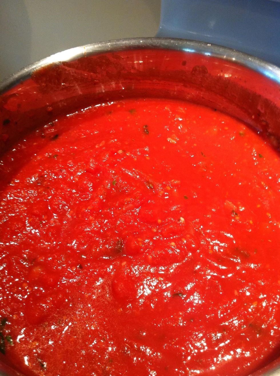 Let cool. Label 5 Ziplock bags with the current date and 5 ladles of sauce into freezer Ziplock bags. Let air out. Place flat in freezer. Thaw bag and warm sauce in a saucepan. Serves 4-5.