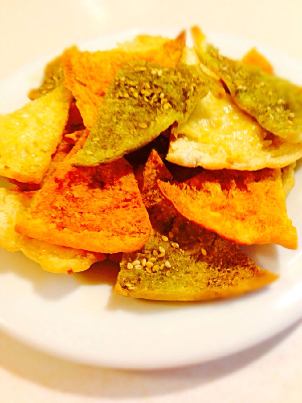 Arrange pita slices on non stick baking sheet and brush them in oil mixture. Bake for about 5-7 min. Watch for chips not to burn