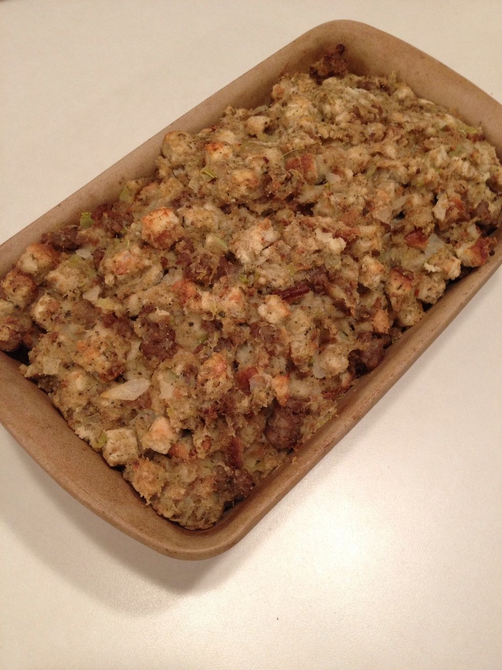 Separate stuffing into two separate bread pans. Freeze one for future use! Cover the other one with aluminum foil and place in the oven.