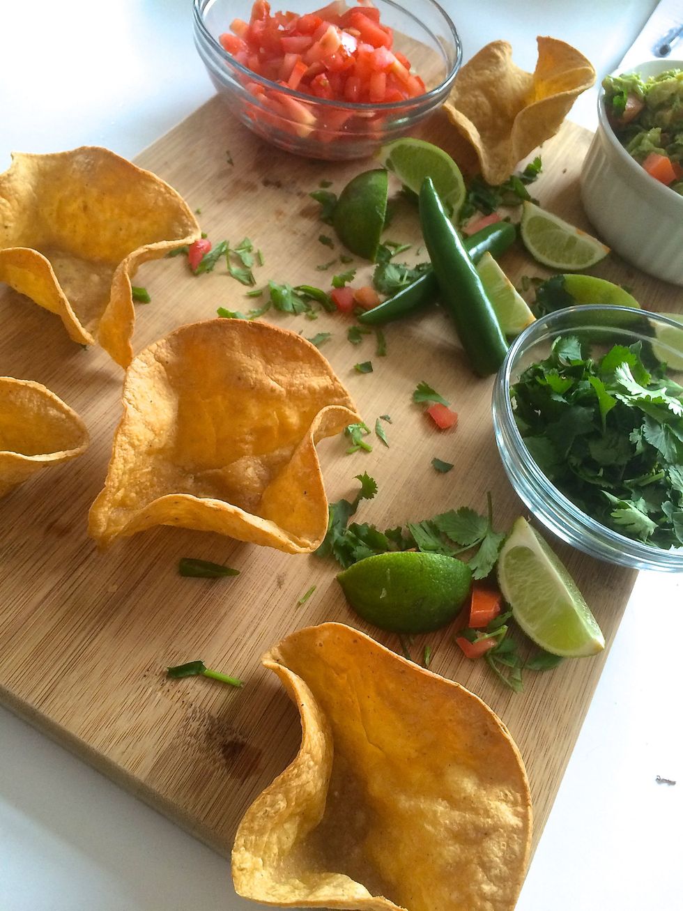 Lightly brush tortillas with oil and bake in an upside-down muffin pan. For more recipe info: http://frommeat2roux.com/2015/01/31/mini-burrito-bowls/