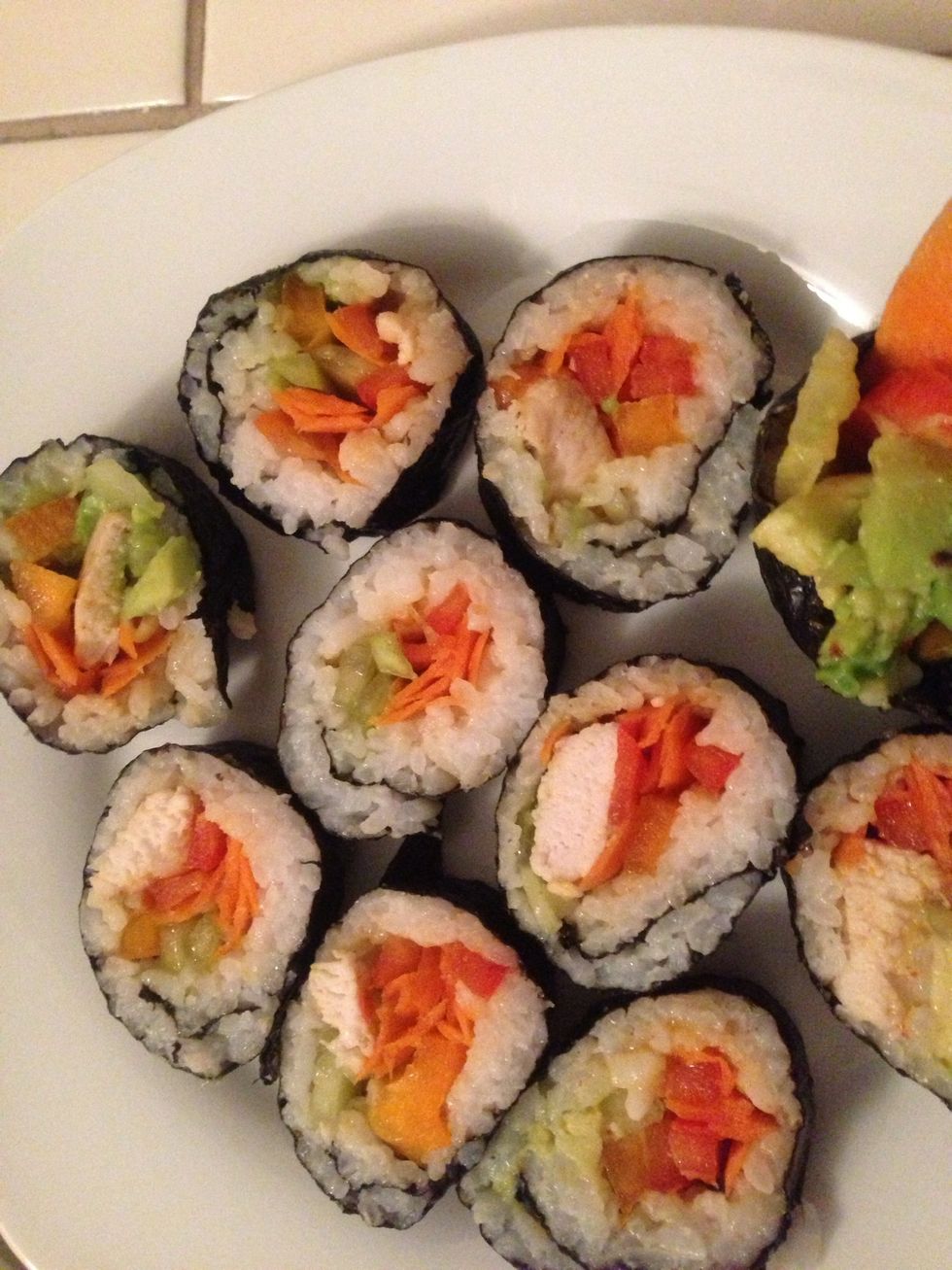 Time to arrange the veggies! As you can see we also stuffed with crab and chicken. I only used chicken, sushi doesn't have to be fishy! Place it horizontally across the seaweed about 1/4 of the way up